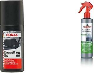 SONAX Kunststoff Neu Schwarz (100 ml) zur Farbauffrischung stark ausgebleichter Kunststoffe im Fahrzeugaußenbereich | Art-Nr. 04091000 & NIGRIN 74036 Kunststoff-Tiefenpflege 300 ml seidenmatt